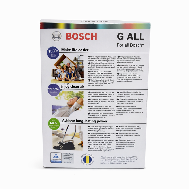 طراحی استاندارد این کیسه باعث نصب آسان و سازگاری کامل با جاروبرقیهای بوش و زیمنس با توان ۲۰۰۰ تا ۲۵۰۰ وات میشود. استفاده از الیاف مصنوعی چندلایه علاوه بر افزایش طول عمر کیسه، از افت مکش در زمان پر شدن جلوگیری کرده و عملکرد یکنواخت جاروبرقی را تضمین میکند.